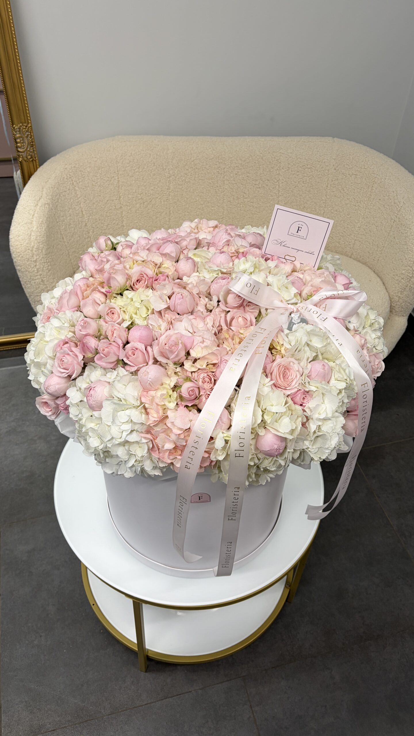 Будьте першим, хто залишив відгук на “Біло рожева композиція з гортензій, кущових та одноголових садових троянд”