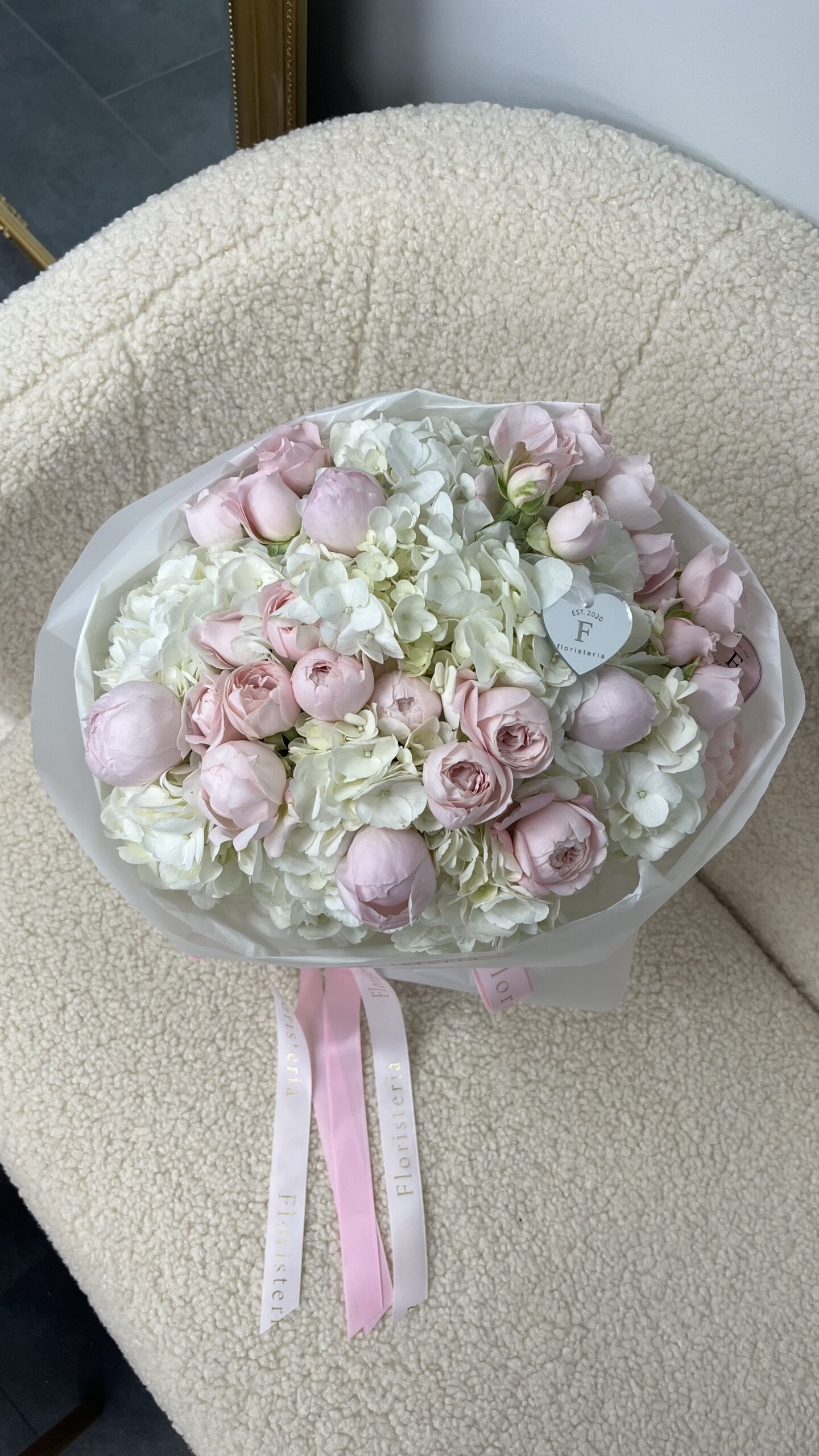Будьте першим, хто залишив відгук на “Букет з білих гортензій та садових троянд”