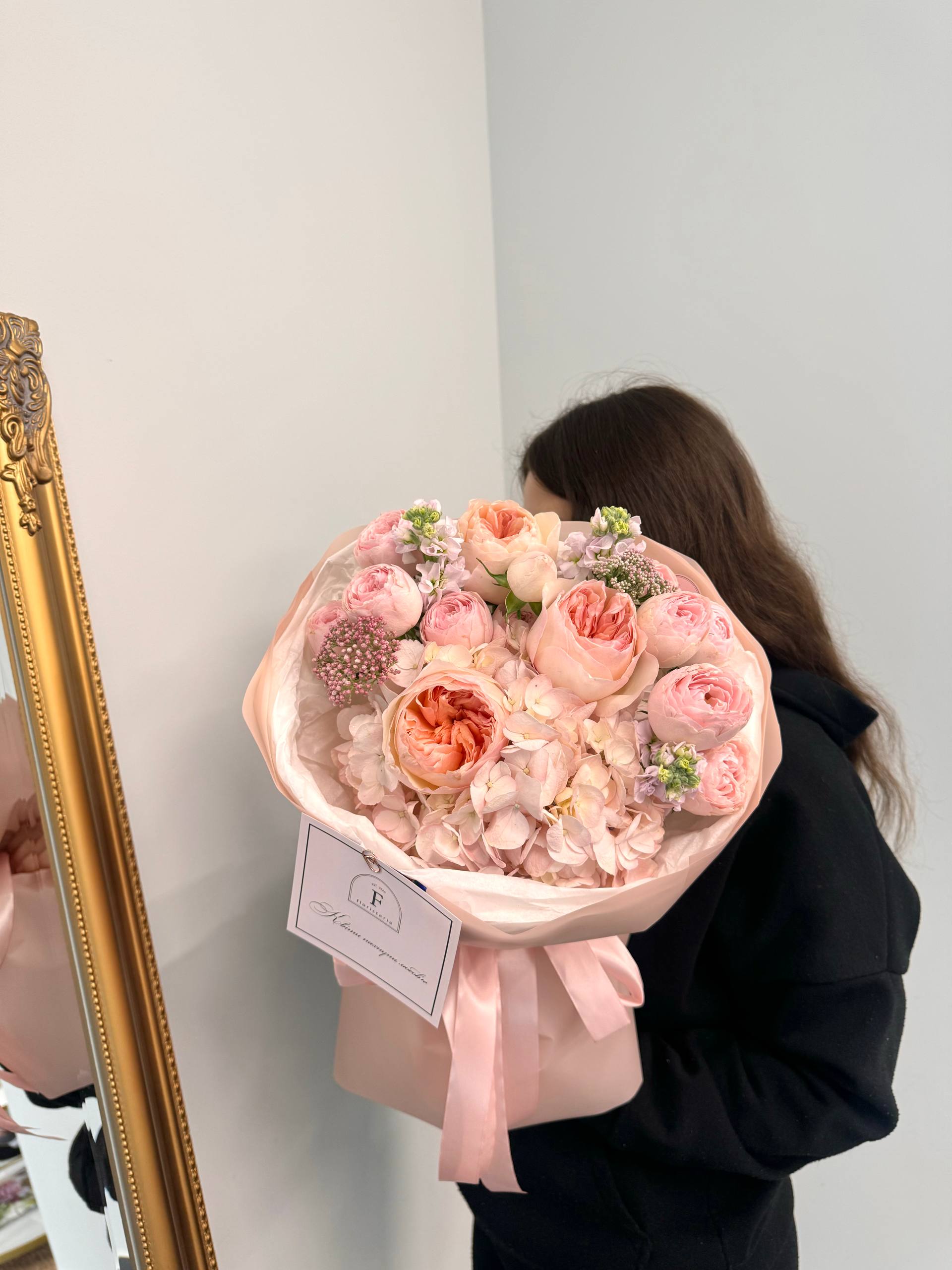 Будьте першим, хто залишив відгук на “Букет з гортензій, матіоли, озотамнуса та троянд”