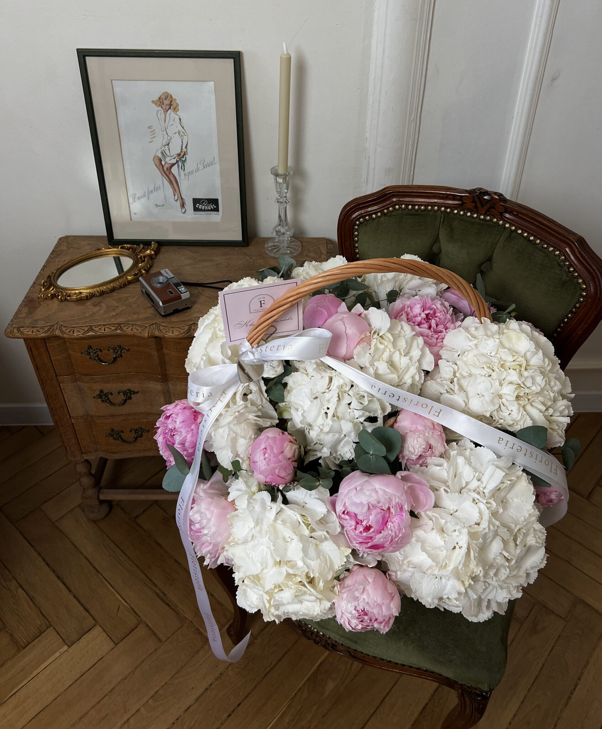 Композиця в корзині з рожевих півоній, білих гортензій та евкаліпту