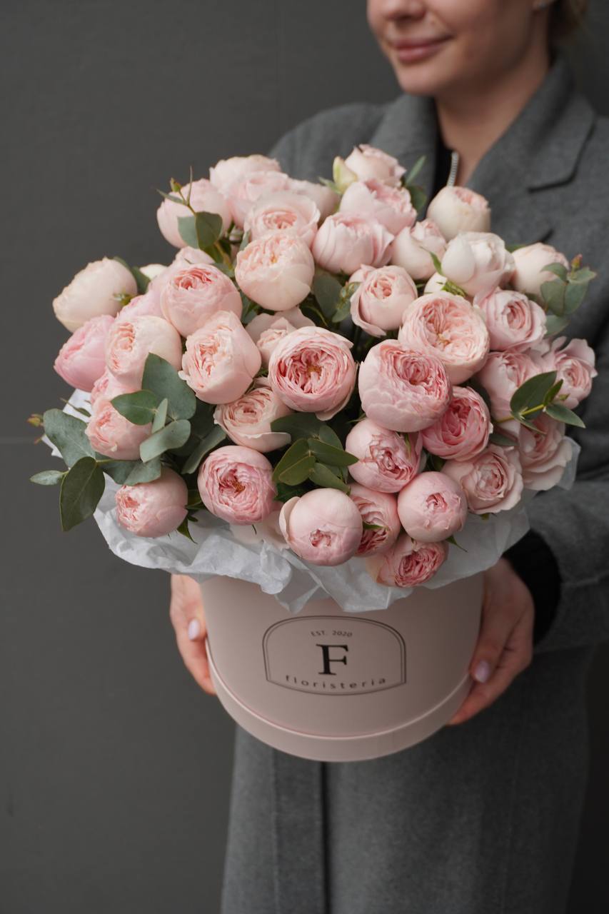 Композиція в коробці з евкаліпту та кущової троянди Mansfield Park