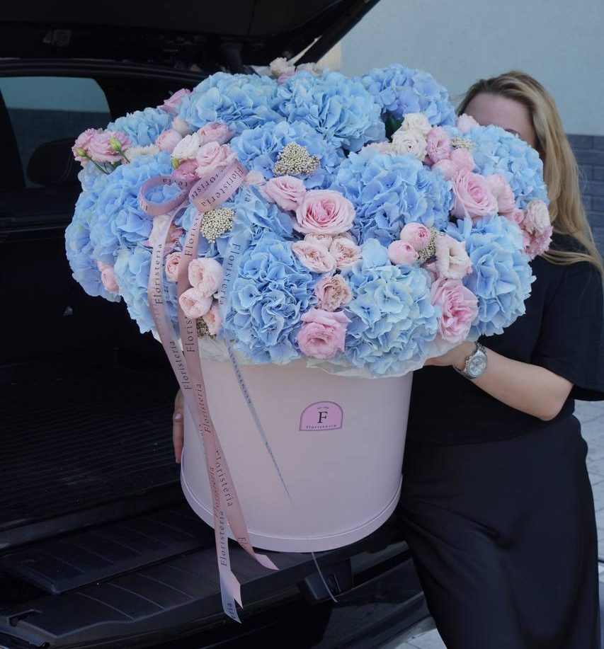 Композиція в розмірі ХL з блакитної гортензії, піоновидних троянд та еустоми