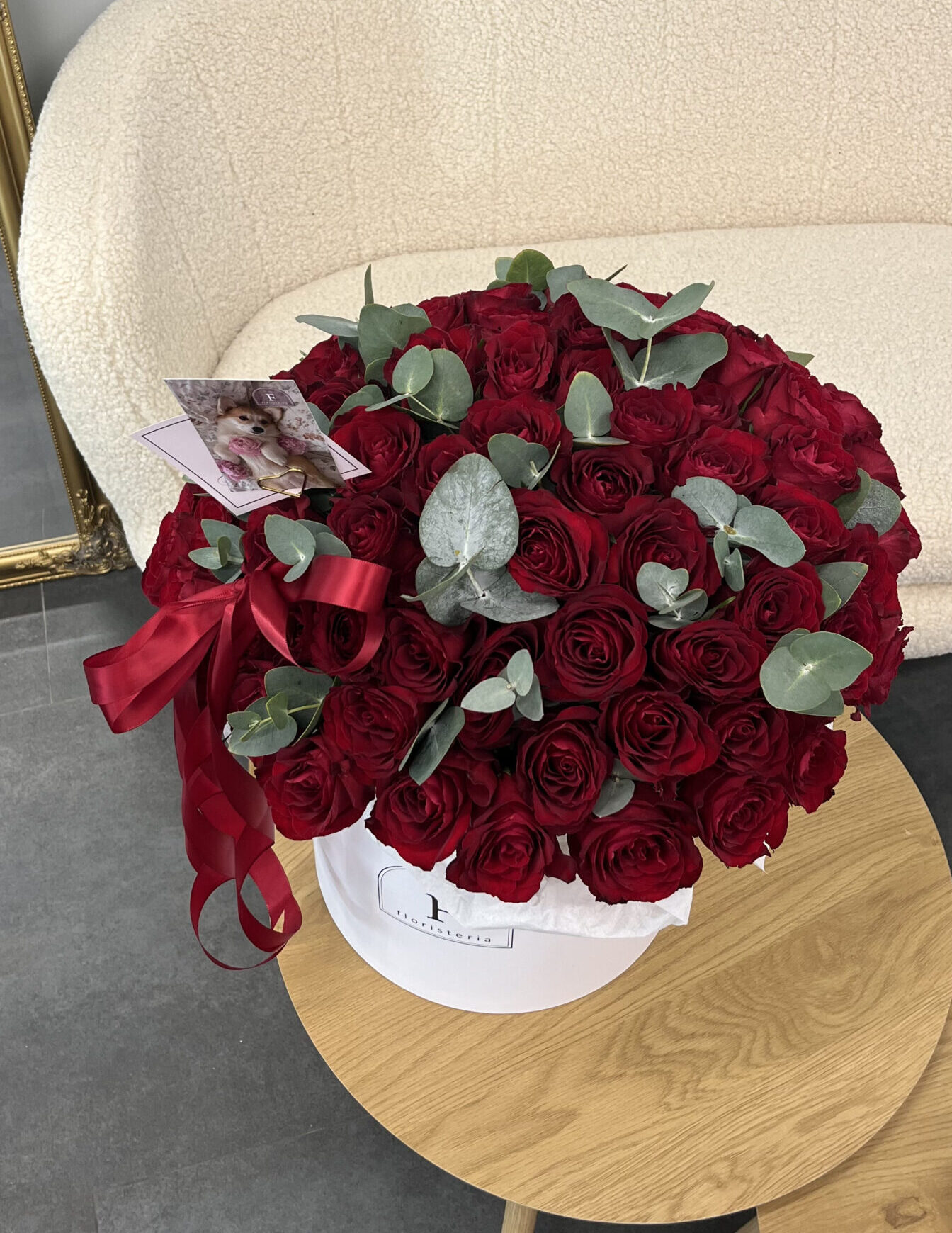 Будьте першим, хто залишив відгук на “Композиція з 73 червоних троянд та евкаліпту”