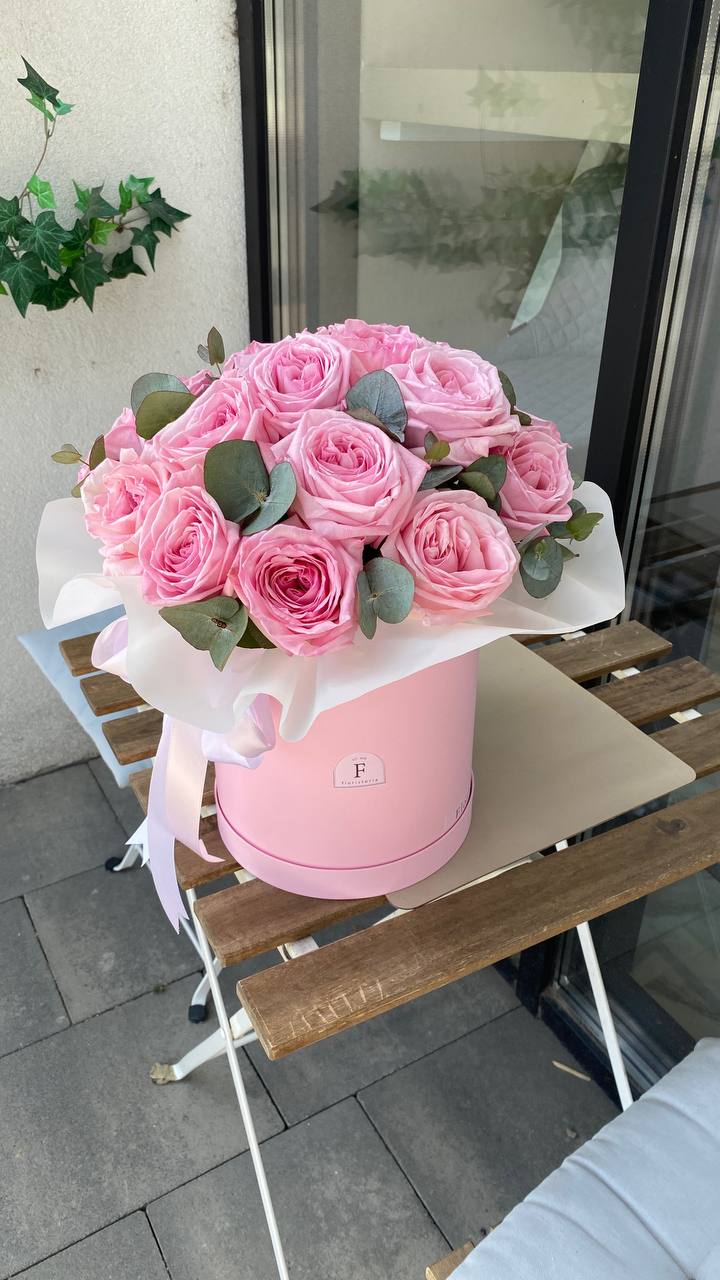 Будьте першим, хто залишив відгук на “Композиція в коробці з 21 піоновидної троянди сорту Pink O’Hara та евкаліпту”