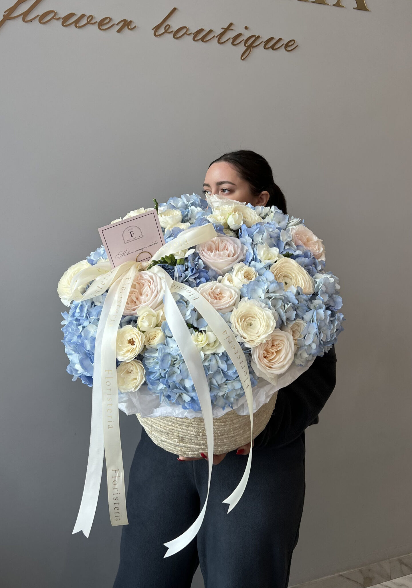 Кошик з блакитних гортензій, ранункулюсів та піоновидних троянд
