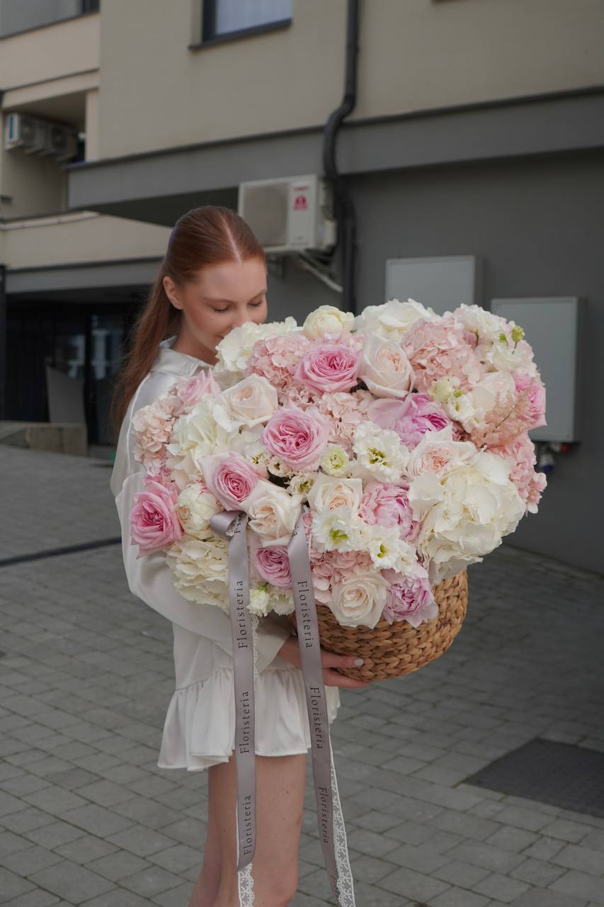 Кошик з півоній, піоновидних троянд, еустоми та гортензій
