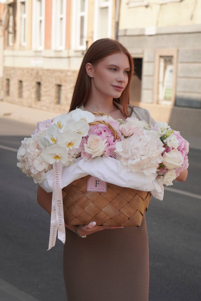 Кошик з троянд, орхідеї, гортензій, еустоми та додатків
