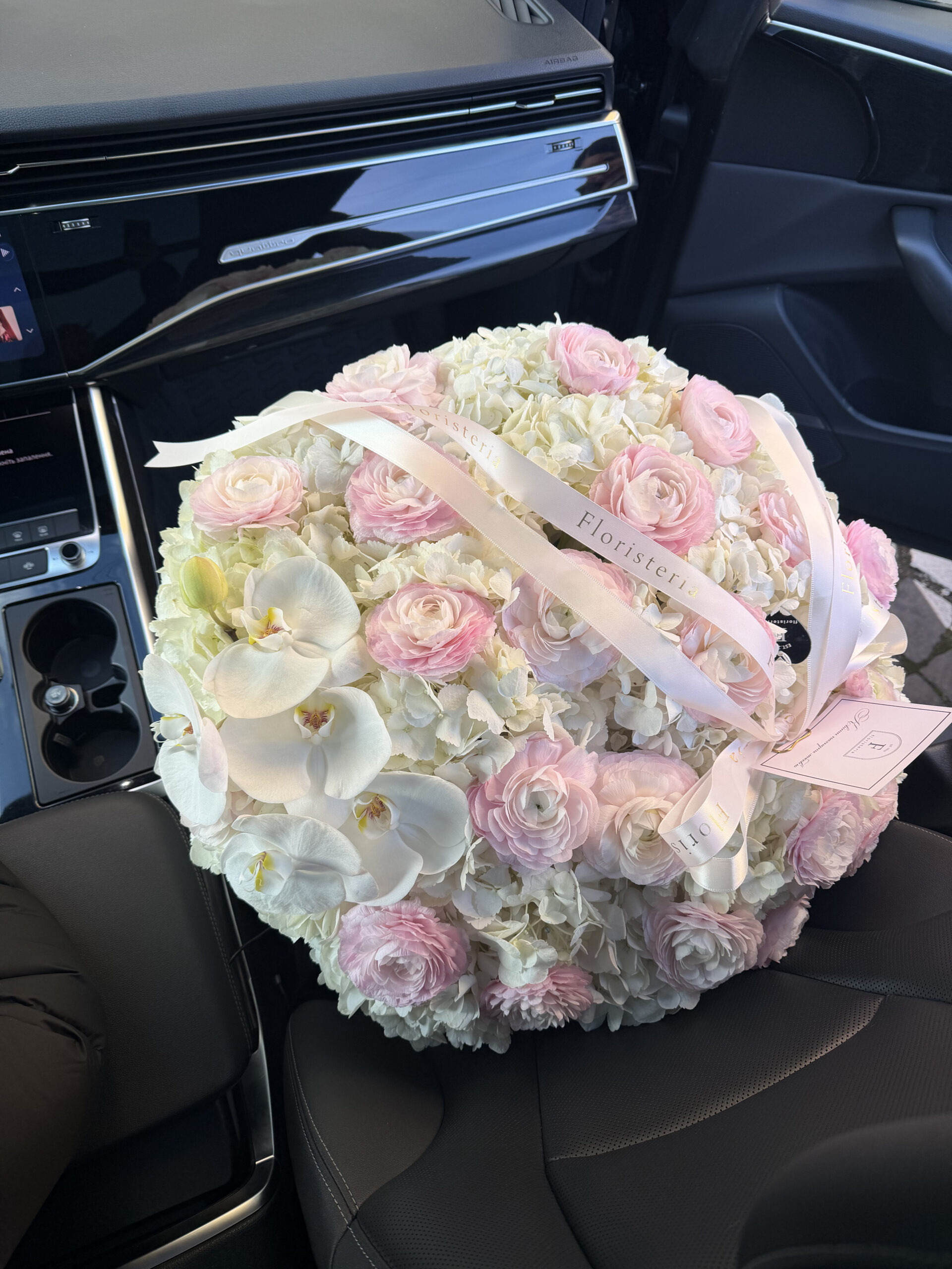 Ніжна композиція в плетеному кошику з білих гортензій, ранункулюсів та орхідей