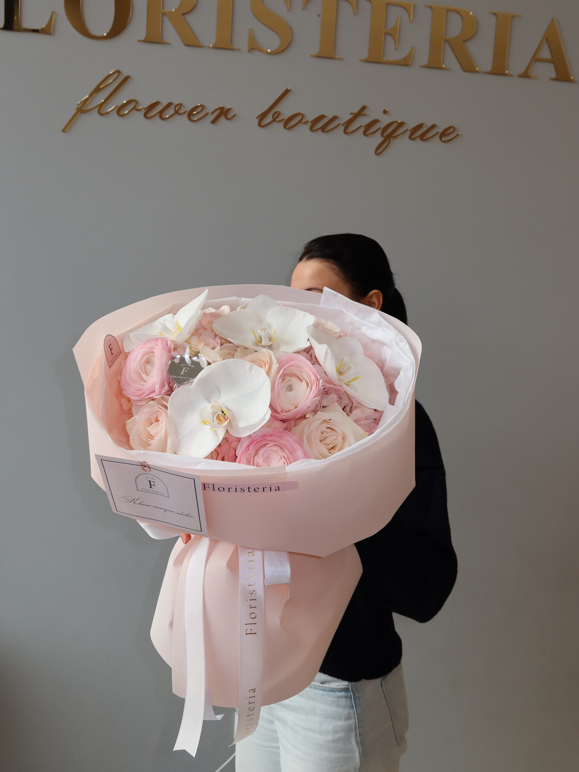 Ніжний мікс з рожевих гортензій, ранункулюсів, піоновидних троянд та орхідей