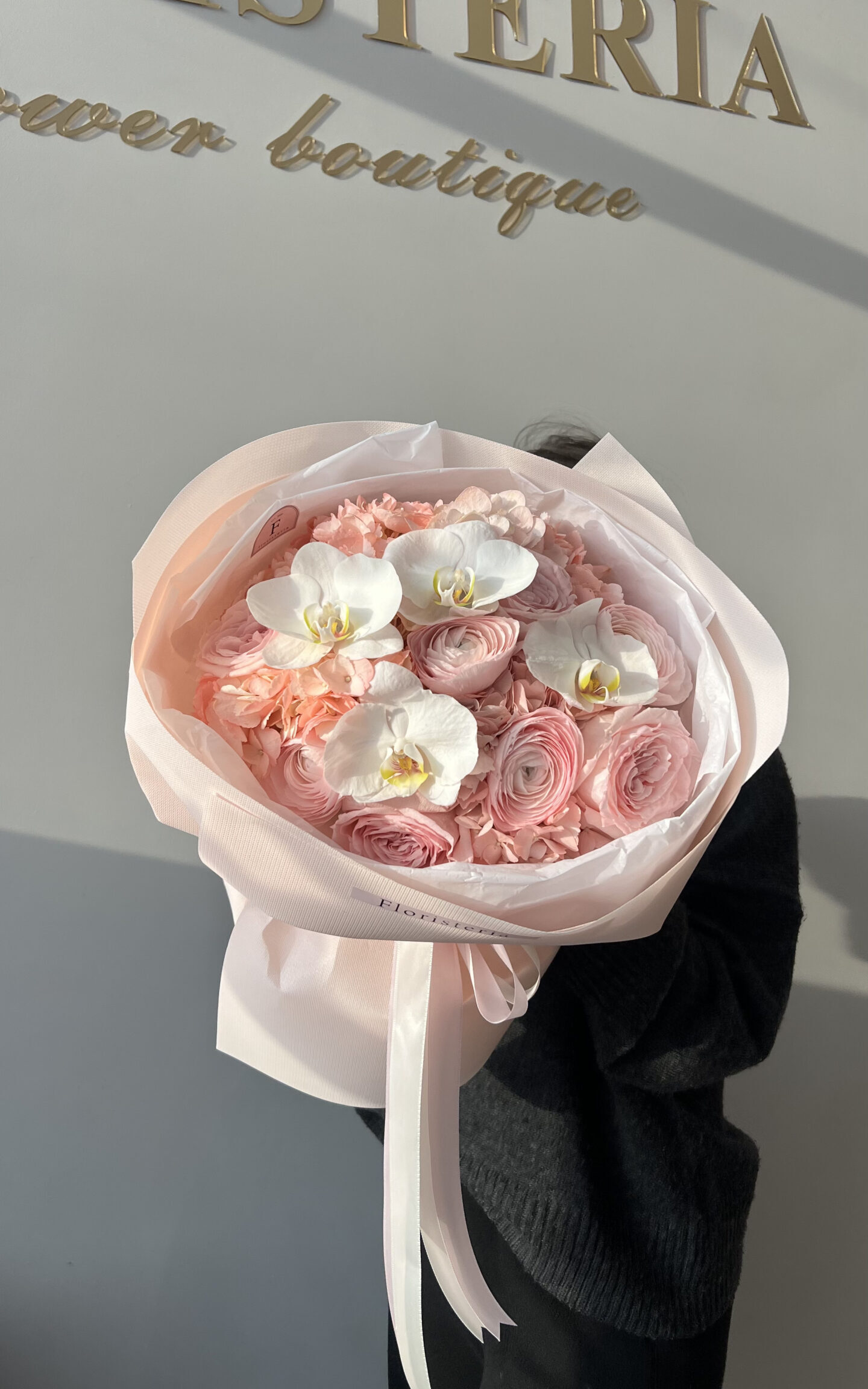 Ніжний рожевий букет з орхідей, ранункулюсів та гортензій