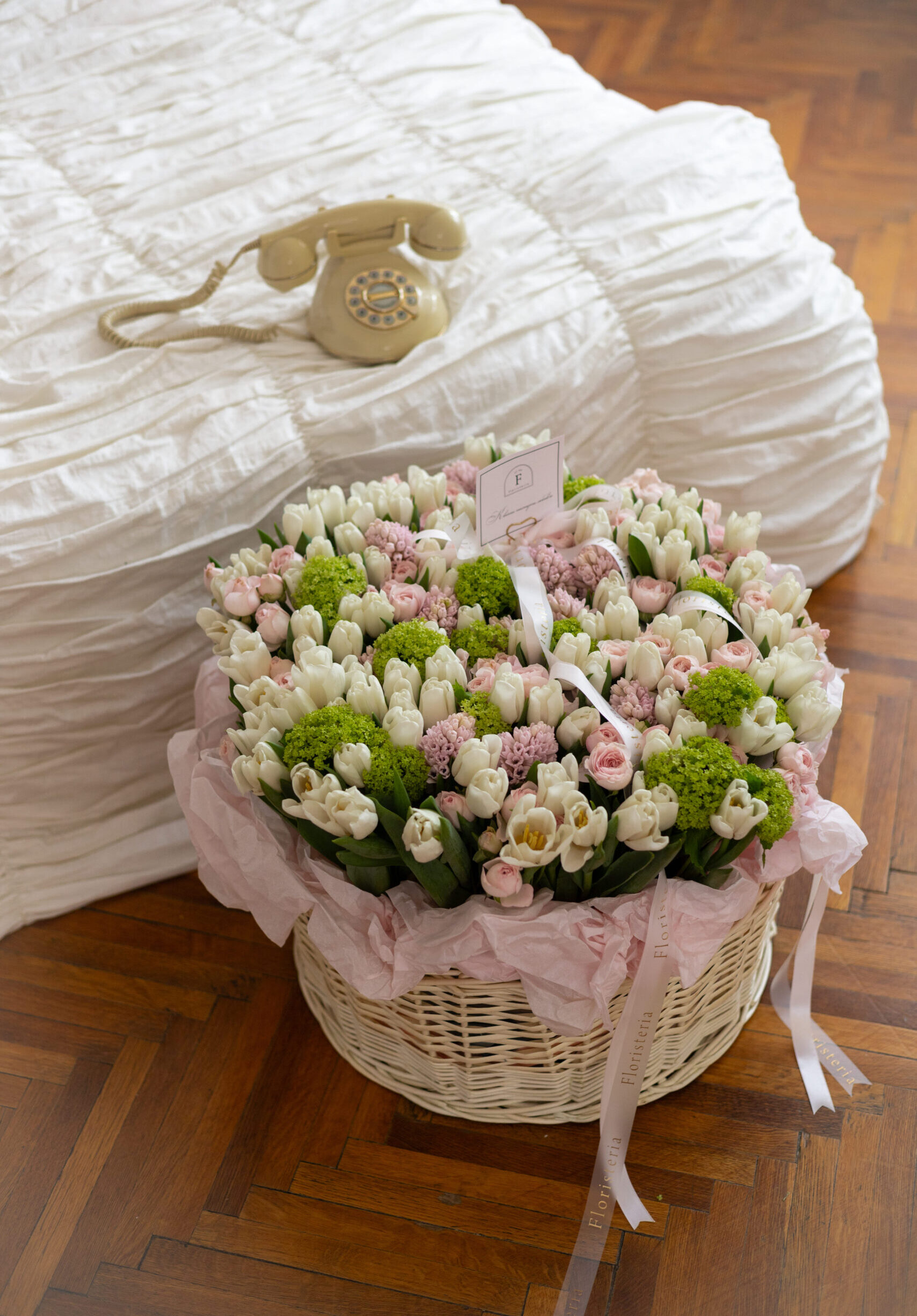 Весняне поєднання тюльпанів, троянд, ароматних гіацинтів та вібурнуму