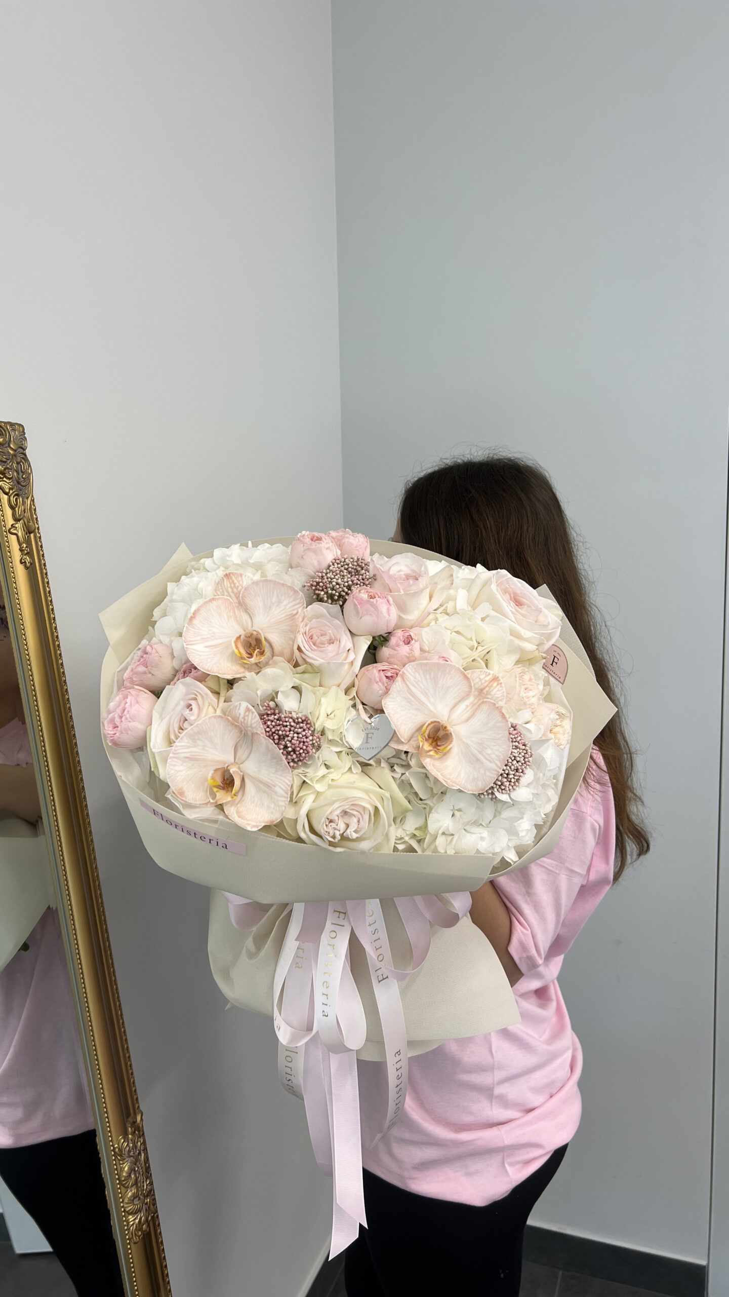 Будьте першим, хто залишив відгук на “Букет в пастельній колористиці з гортензій троянд та орхідей”