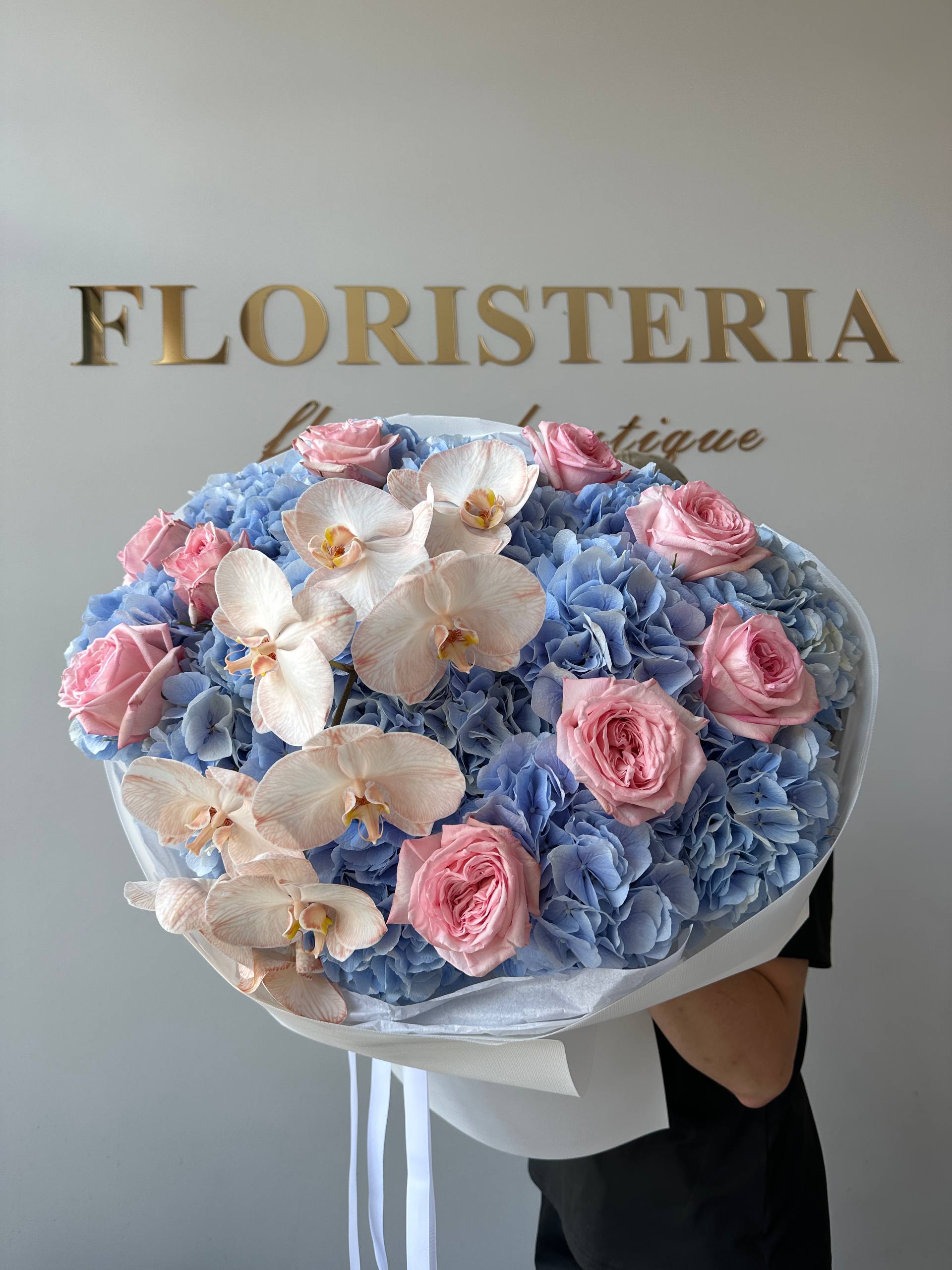 Букет з блакитної гортензії, піоновидної троянди та орхідеї