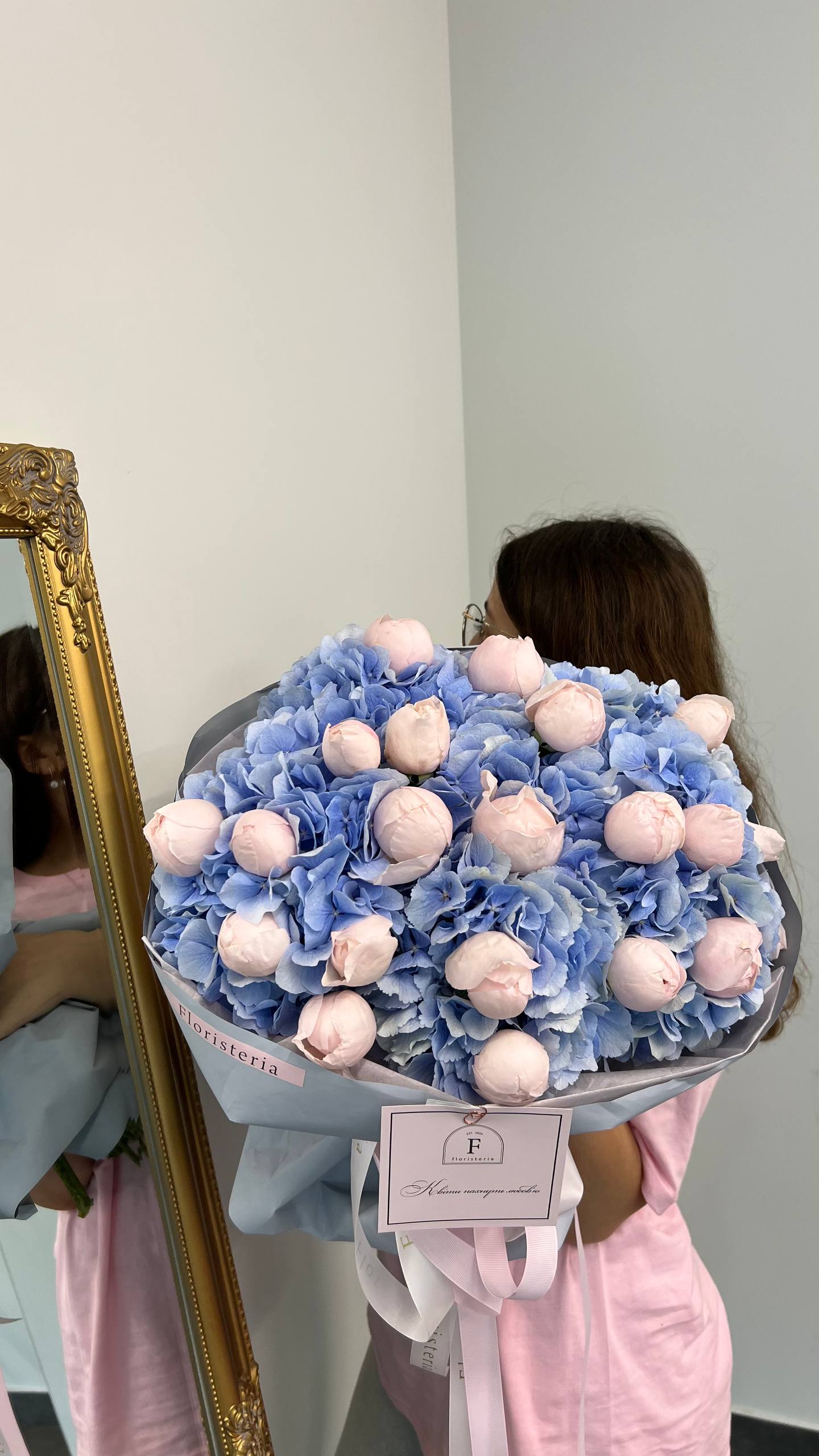 Букет з блакитної гортензії та садової троянди Peony Pink