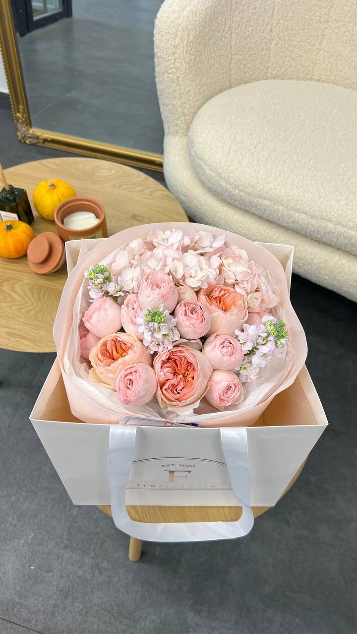 Будьте першим, хто залишив відгук на “Букет з гортензії, піоновидних троянд та матіоли”