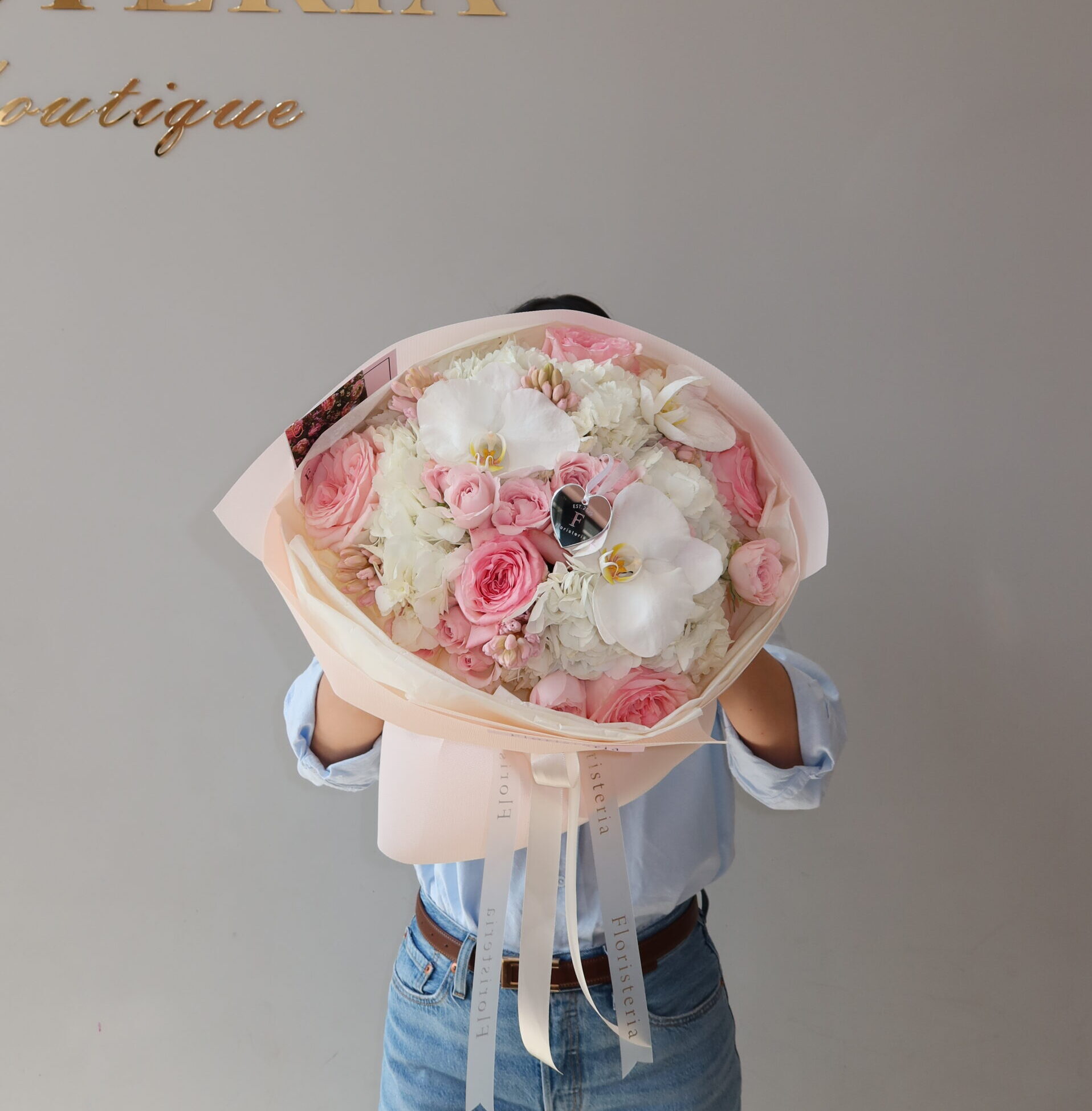 Будьте першим, хто залишив відгук на “Букет з гортензій, піоновидних троянд, білих орхідей та гіацинтів”