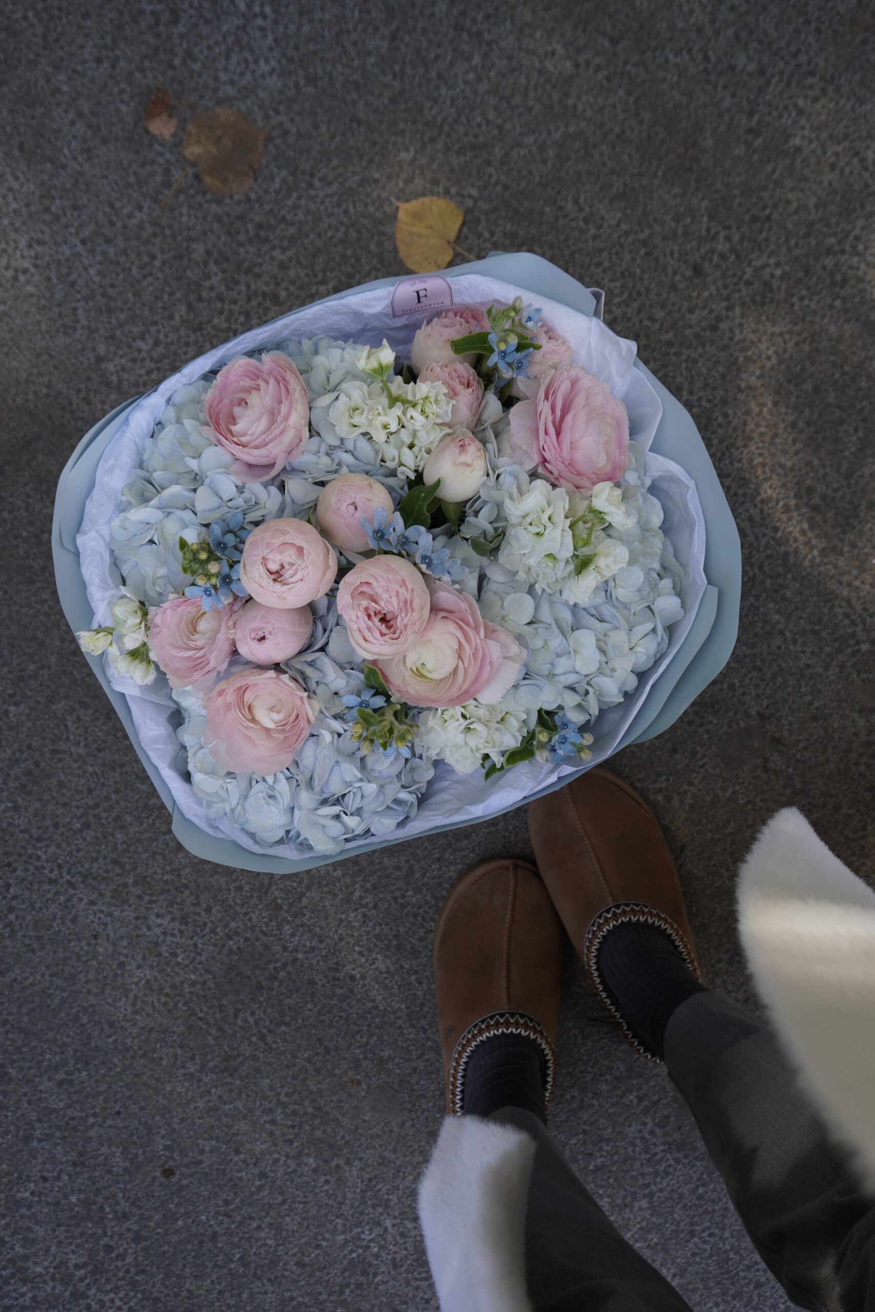 Букет з гортензій, ранункулюсів, троянд, оксипеталума та матіоли