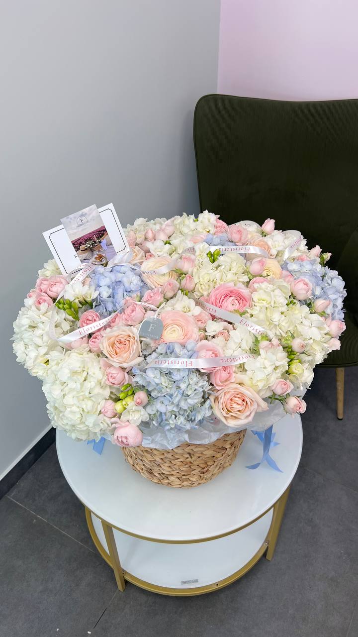Композиція в кошику в ніжній колористиці з міксу квітів