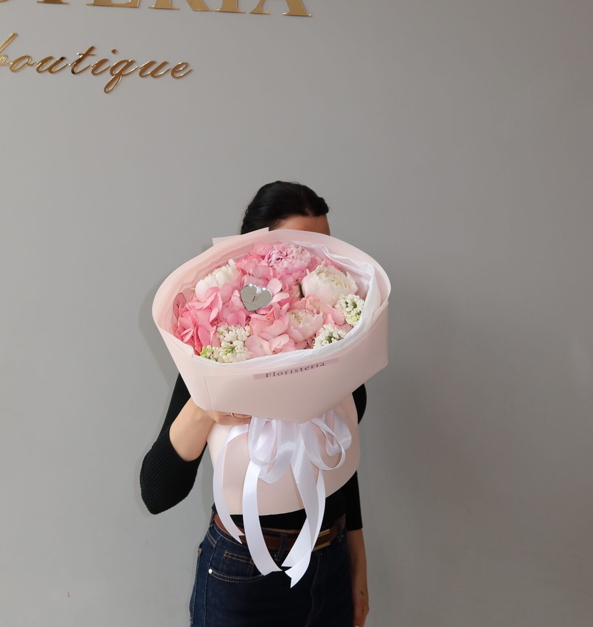 Ніжно рожевий букет з півоній, бузку та рожевої гортензії