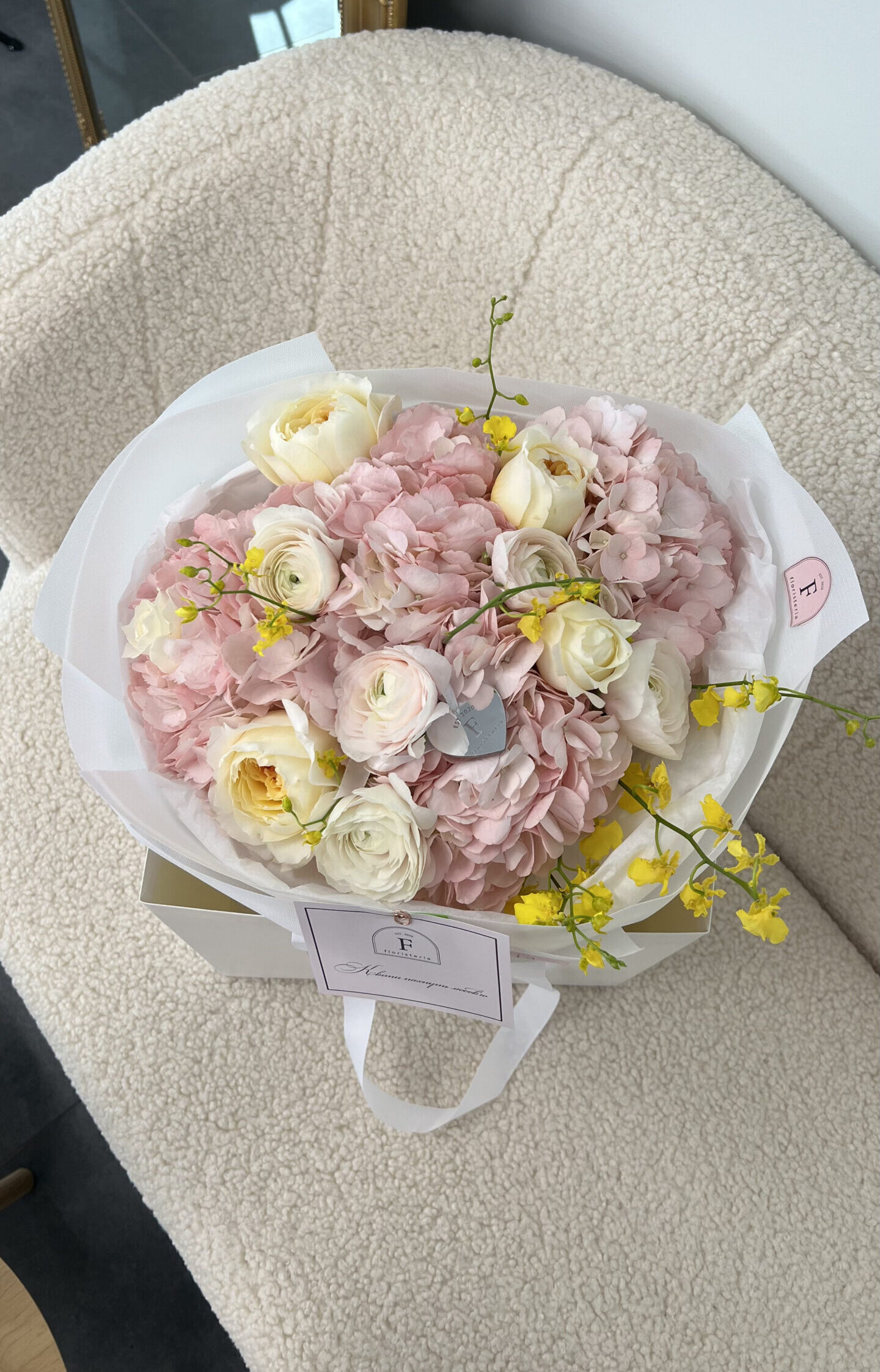 Ніжно рожевий мікс з трояндами, ранункулюсами та жовтим онцидіумом