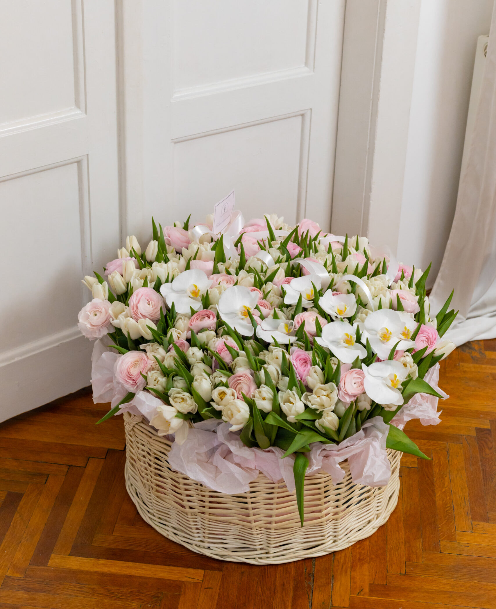 Розкішна композиція з тюльпанів, ранункулюсів та білосніжних орхідей